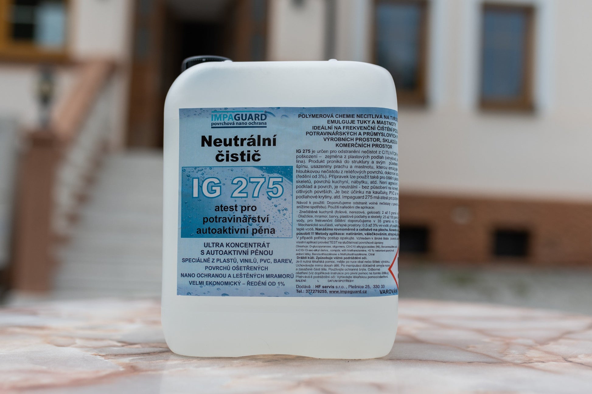 IG 275 je speciálně vyvinutý čistič pro plasty, vinyl, PVC, barevné povrchy, leštěný mramor a povrchy ošetřené nano ochranou, s atestem pro potravinářské použití. Je necitlivý na tvrdost vody a výborně emulguje tuky a mastnotu. Efektivně odstraňuje hloubkovou nečistotu z reliéfových povrchů a je schopný odstranit staré nečistoty i při ředění od 3 %.